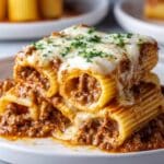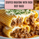 This delicious Baked Rigatoni Stuffed with Beef Ragu & Mozzarella is a comforting Italian-inspired dish featuring large rigatoni tubes filled with a rich, savory beef ragu, topped with melted mozzarella and Parmesan cheese, then baked to golden perfection. Perfect for a hearty family dinner, this recipe combines tender pasta with a flavorful meat sauce and cheesy topping for an irresistible meal.