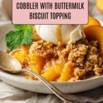 Keywords: peach cobbler, skillet cobbler, fruit dessert, biscuit topping, cast iron skillet dessert, summer dessert, peach dessert