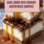 Delicious Butterfinger Caramel Cheesecake Bars feature a buttery graham cracker crust topped with a creamy cheesecake layer folded with chunks of Butterfinger candy bars. Finished with a luscious caramel sauce, more Butterfinger pieces, and optional drizzled chocolate, these bars are rich, sweet, and perfect for satisfying any dessert craving.