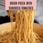 Keywords: Caramelized onion pasta, creamy pasta, sundried tomato pasta, chili crisp pasta, Italian pasta recipe, linguine recipe, buccatini recipe