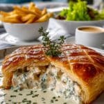 This dish pairs well with simple sides like steamed vegetables, mashed potatoes, or a fresh green salad to balance the richness of the pastry and sauce.