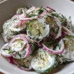 Keywords: creamy cucumber salad, cucumber salad, sour cream salad, yogurt cucumber salad, dill cucumber salad, no-cook salad, refreshing side dish