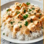 - Step 8: Serve the chicken and creamy sauce over cooked white rice. Garnish with fresh parsley before serving.