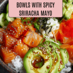 - Assemble Bowls: Spoon a serving of ginger scallion rice into each bowl. Top with crispy salmon bites, cooked edamame, sliced cucumbers, shredded purple cabbage, and avocado slices. Drizzle with sriracha mayo and sprinkle with sesame seeds. Serve immediately.