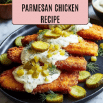 This Dill Pickle Parmesan Chicken recipe is a flavorful and easy-to-make baked chicken dish featuring juicy boneless, skinless chicken breasts topped with crunchy dill pickles and golden, crispy Parmesan cheese. Complemented by a tangy Greek yogurt and lemon sauce, this meal offers a delicious blend of creamy, savory, and tangy flavors perfect for a quick weeknight dinner.