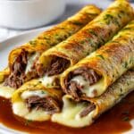 Store any leftover roll ups in an airtight container in the refrigerator for up to 2 days. Reheat in an oven or toaster oven at 350°F until warmed through to retain crispiness. The au jus can be reheated gently on the stove. For best texture, avoid microwaving as it may make the tortillas soggy.