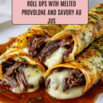French Dip Tortilla Roll Ups are a fun twist on the classic sandwich, combining tender roast beef, melty provolone, and crispy fried onions wrapped in warm tortillas. Baked to golden perfection and served with a flavorful au jus dipping sauce, they make a perfect appetizer or party snack.