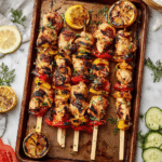 These Greek Chicken Kabobs are a flavorful and vibrant dish featuring marinated chicken cubes grilled to perfection alongside fresh vegetables and lemon slices. Served with traditional tzatziki sauce, olives, cucumbers, tomatoes, feta cheese, and warm pita bread, this recipe brings the authentic taste of Greece to your table. Perfect for a summer cookout or a Mediterranean-inspired dinner, the combination of herbs, garlic, and citrus offers a deliciously balanced meal.