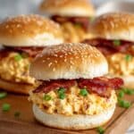 - Add Bacon and Serve: Stir in the chopped bacon pieces, reserving some for garnish if desired. Spoon the crack chicken mixture onto hamburger buns. Garnish with additional bacon, cheese, and chopped green onions before serving.