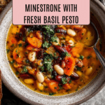 8. Serve: Ladle the hot minestrone into bowls and top each serving with generous spoonfuls of freshly made basil pesto. Optionally, sprinkle grated Parmesan cheese on top for extra flavor.