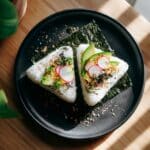 Onigiri is best eaten fresh but can be stored in an airtight container in the refrigerator for up to 24 hours. To enjoy later, let it come to room temperature or warm slightly in the microwave wrapped in a damp paper towel. Avoid storing with nori wrapped, as it will become soggy; add nori just before serving.