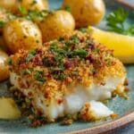 Lemony Herb-Crusted Cod with Parmesan Crunch is a bright and flavorful baked fish dish featuring tender cod fillets coated in a zesty lemon and herb mixture topped with a crunchy layer of parmesan cheese. This easy-to-make recipe offers a deliciously crispy and cheesy crust that perfectly complements the flaky, mild cod, making it ideal for a healthy weeknight dinner or an elegant meal.