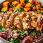 - Assemble the bowls: Slice the cooked chicken into strips. In each serving bowl, arrange a base of cooked quinoa or brown rice, add a portion of the roasted sweet potatoes, and some fresh baby spinach or kale.