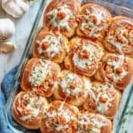 3. Step 3: Arrange the Hawaiian rolls tightly in a 9×13″ baking pan. Using a serrated knife, carefully cut a hole in the center of each roll, making enough space for the filling. Brush the tops of the rolls and the inside of each hole with the garlic butter evenly. Bake for 6-8 minutes to toast the rolls and melt the butter, then remove from the oven.