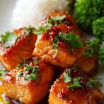 - Glaze and Caramelize: Once the salmon is mostly cooked through, reduce heat to medium-low and pour the reserved marinade over the salmon. Continue cooking for another 2-3 minutes, spooning the glaze over the bites frequently until the sauce thickens and caramelizes, coating the salmon beautifully.