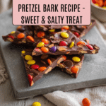 Keywords: Peanut Butter Pretzel Bark, no-bake dessert, peanut butter chocolate bark, easy chocolate bark, salty sweet snack