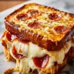 This Pizza Grilled Cheese recipe combines the comforting gooeyness of a classic grilled cheese sandwich with the bold, savory flavors of a pepperoni pizza. Using a skillet to toast buttery, seasoned bread layered with marinara sauce, mozzarella, Parmesan, and pepperoni, this quick and easy meal is perfect for lunch or dinner and offers a delightful twist on two favorites.