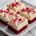 11. Frost and Serve: Spread the cream cheese frosting evenly over the cooled bars. Optionally, top with red velvet crumbs for texture and visual appeal. Slice into squares and serve.