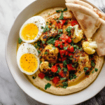 This Roasted Cauliflower Hummus Bowl recipe combines the smoky, spiced goodness of roasted cauliflower with creamy, homemade hummus for a nutrient-packed meal. Enhanced with fresh tomatoes, parsley, and optional toppings like soft boiled egg or pulled rotisserie chicken, this bowl is perfect for a satisfying, healthy lunch or dinner. The roasted cauliflower adds a delightful texture and depth to the classic hummus, making it a nutritious and flavorful creation.