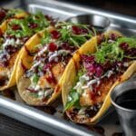 Smash Dumpling Tacos are a delightful fusion dish combining the crispy texture of pan-fried dumplings with the fresh, crunchy bite of cabbage and a flavorful sauce. Ground meat is pressed onto dumpling wrappers, then pan-fried until golden and crispy. These tacos offer a satisfying blend of crispy exterior and savory filling, perfect as an innovative appetizer or a tasty snack.
