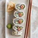 7. Slice and serve: Using a sharp serrated knife, dip the blade in water between cuts to prevent sticking and slice the sushi roll into pieces about 3/4 to 1 inch thick. Trim the ends for cleaner edges if desired. Arrange the rolls on a serving plate and serve with wasabi, pickled ginger, and soy sauce if preferred.