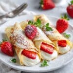 Delightful and easy-to-make Strawberry Cannoli Cones featuring crispy waffle cones filled with creamy ricotta cheese sweetened with sugar, topped generously with fresh strawberries. This no-bake dessert is perfect for a quick treat or a summer party snack.