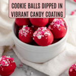Delightfully sweet and festive Sugar Cookie Balls made by blending sugar cookies with cream cheese, then coated in vibrant red candy melts and topped with sprinkles. These no-bake truffles are perfect for holiday treats or any special occasion.