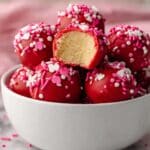 Delightfully sweet and festive Sugar Cookie Balls made by blending sugar cookies with cream cheese, then coated in vibrant red candy melts and topped with sprinkles. These no-bake truffles are perfect for holiday treats or any special occasion.