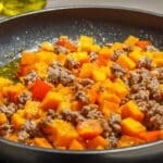 - Cook Ground Beef: While the sweet potatoes roast, heat a skillet over medium heat. Add the ground beef, seasoning with salt and pepper. Cook until browned and fully cooked through, breaking it apart with a spatula as it cooks, about 8-10 minutes. Drain any excess fat if necessary.