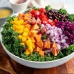 - Combine salad ingredients: In a large bowl, add the chopped kale as the base. Layer the chopped tomatoes, cooked and chopped sweet potatoes, sliced bell pepper, fresh blueberries, sliced red onion, and cooked cubed beets over the kale to create a colorful and nutrient-dense mix.