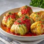 Tender stuffed cabbage rolls are a comforting, hearty dish perfect for any occasion. Packed with a savory blend of ground beef, pork, rice, and spices, then baked in a flavorful tomato sauce, these rolls are sure to satisfy your cravings. This recipe guides you through making them from scratch with ease.