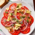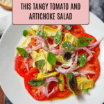 A fresh and vibrant Tomato and Artichoke Salad featuring tangy capers, crisp red onion, and aromatic oregano, dressed simply with olive oil and lemon juice. This easy no-cook salad highlights the natural flavors of ripe tomatoes and tender artichokes, perfect as a light lunch or a flavorful side dish.