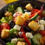 To keep croutons crunchy, add them right before serving rather than mixing them too early with the tomatoes and dressing.