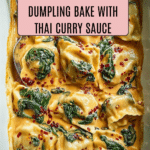 Keywords: Trader Joe’s, dumpling bake, coconut milk, Thai curry, spinach, frozen dumplings, chili oil, easy dinner, one-dish meal