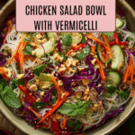 - Assemble the Salad Bowl: In serving bowls, layer the cooked rice vermicelli noodles with grated carrot, cucumber sticks, and lettuce. Add the cooked chicken on top, sprinkle with fresh mint and cilantro, and finish with crushed peanuts if desired. Serve with the Nước mắm fish sauce dressing on the side or drizzled over the bowl.